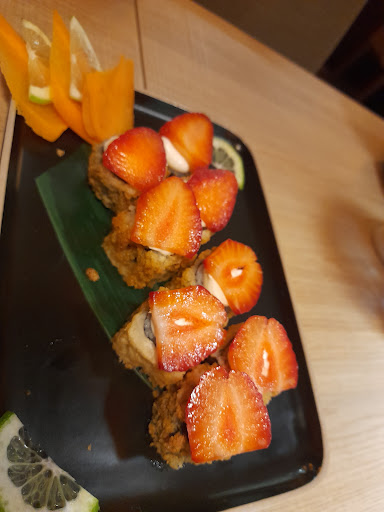 Después, elegimos varios platos de la carta y todos estaban buenísimos: tempura de langostinos, uramaki carpi y spicy, nigiri de salmón flameado y de atún y hosomaki exquisit tempu (con atún, queso y fresas).