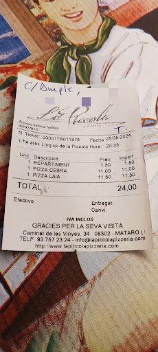 Read moreDemanem a La Piccola perque ens agraden les pizzes d’aqui i tenen massa sense gluten i formatge sense lactosa, però en vàries ocasions no han complert els estandards de qualitat a domicili. Aquest vegada ha estat esperpèntic… amb un nen de 5 anys esperant el sopar, hem estat dues hores esperant i quan ha arribat la comanda, la seva pizza no portava el pernil ibèric que haviem demanat. Una de les pizzes era petitona…