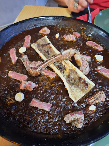 Vam optar pel pa amb tomàquet, braves, pota de pop a la brasa, super cachopo amb salsa cabrales i dos arrossos/fideuàs per dos, el de sípia, txuletón i moll de l'òs (molt top) i la fideuà negra. De postres vam demanar torrija i cheesecake. Tot estava boníssim!
