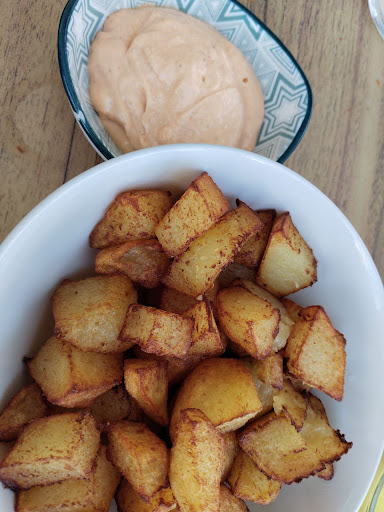 Hemos estado varias veces cenando a base de tapas, y esta semana hemos ido a comer de menú a mediodía. Esta es nuestra experiencia. Ya sea para cenar en verano o cuando el tiempo lo permite, la terraza es muy agradable, alejada de los vehículos y en zona peatonal. Ideal para ir con niños o con mascota. Si simplemente tomas algo de beber, te ponen una tapa de frutos secos o si vas a comer y mientras esperas el primer plato te ponen unas aceitunas para ir abriendo apetito. Las tapas son deliciosas, las patatas bravas no son congeladas (siempre lo agradezco) y acompañadas de una buena salsa. Lo mismo tengo que decir de los chipirones a la andaluza y de los calamares a la romana, todo fresco y muy bueno. Aunque no los he probado todavía, también tienen bocadillos y ensaladas. En cuanto al menú, estuvimos en pareja comiendo y pedimos de primero unos Fetuccini. La pasta estaba al dente, bien condimentada y en cantidad generosa. De segundo pedimos una butifarra (al punto) con patatas fritas (caseras y muy buenas) y una fideuá, muy buena también y ración abundante. Acabamos con los postres, una macedonia y un sorbete (Viatge a l'Havana, lo recomiendo). Muy buena relación calidad/precio, el menú del mediodía, con bebida y café nos salió por unos 22€ la pareja. El servicio es rápido, amable, profesional y atento, añadiendo además simpatía (algo que no abunda ultimamente)....