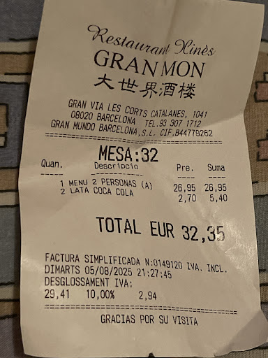Una cena decepcionante desde que entramos. Fui con mi pareja ayer a cenar y desde que entramos el camarero fue de lo mas seco que existe, al preguntarle por el menu que tenían fuera, nos dijo que no se sirve por la noche ni festivos, a pesar de que no dice nada de las noches el menu en cuestión, acatamos y decidimos probar el menu mas barato que nos ofrecían para la noche. Ensalada china mal cortada (99%lechuga iceberg), arroz 3 delicias (pasado), los rollitos primavera pequeños y refritos el camarero los sirvió muy elegantemente con pinzas en el mar de salsa blanca que teníamos en el plato de la ensalada (refritos y bañándose en salsa blanca sin que te pregunten si te apetecen rollitos remojados, una « delicia »), la ternera con verduras estaba buena y el pollo con almendras también. Pero cuando me decidí a escribir esta reseña fue con el postre… mi macedonia no era muy variada, pero sl menos se podía comer, mi pareja pidió flan con nata y se olvidaron la nata, pero a los flans de la mesa de al lado les pusieron toda la nata que no le habían puesto al flan de nuestra mesa. Conclusión: Ni volveremos ni lo...
