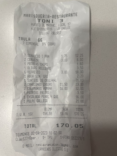 Read moreUna de las peores experiencias que hemos tenido en un restaurante. Tuvimos que esperar casi dos horas para la comida, que nunca llegó como esperábamos: carne pasada, pescado salado… y lo peor es que tuvimos que marcharnos sin comer apenas, ¡y aún así nos cobraron casi 40 euros solo por una copa de vino y un poco de pan con tomate! Nos dijeron que la cocina estaba “colapsada”, pero el restaurante estaba prácticamente vacío. El servicio fue pésimo: indiferente, nada profesional, y ni siquiera mostraron interés cuando nos quejamos. Además, estábamos en la terraza y caía agua constantemente. Una tomadura de pelo total. No lo recomiendo bajo ningún concepto.