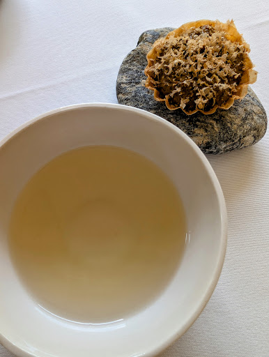 -Casa de piedra, restaurada con estilo, perdido en el Ezaro en la montaña. La casa tiene dos plantas, abajo la cocina y el baño y arriba un pequeño comedor con 6 mesas, que contiene un ventanal grande con vistas a un correo y ventanas en el otro lado con vistas a la montaña rocosa. -No hay carta, si no que la canta al llegar. -El restaurante esta señalizado, entras por un camino asfaltado que da a la entrada, donde tiene un parking la casa. -Restaurante se puede pagar con tarjeta o efectivo .-Solo tiene un Menu Degustación que es Sorpresa. 45 euros personas (Bebidas a parte) -El ritmo de cocina es adecuada sin mucha espera entre plato y plato, dinámico, cosa que me parece un plus. -Buen servicio y buenas recomendaciones de vino . -Precio medio 50-60 euros persona con bebidas -Representación de lo que es el movimiento slow living. -Mucho encanto y comodo -El pan esta incluido en el Menu. -Artesana gallega, para los que les gusta mucho la decoración como a mi, hay unas caras en el comedor, todas las lamparas y las esculturas son de Arturo Alvarez. -Buen pan -Buen cocinero con mucha técnica. -Buenos platos , buena calidad, buena presentación y mucho sabor. -Musica agradable -Decoración exquisita. -Sabor y calidad en boca excelente. -El Chef contesta a todas las preguntas si bajas y le preguntas en la cocina. -Chef y Servicio, muy agradables. -baño cuco