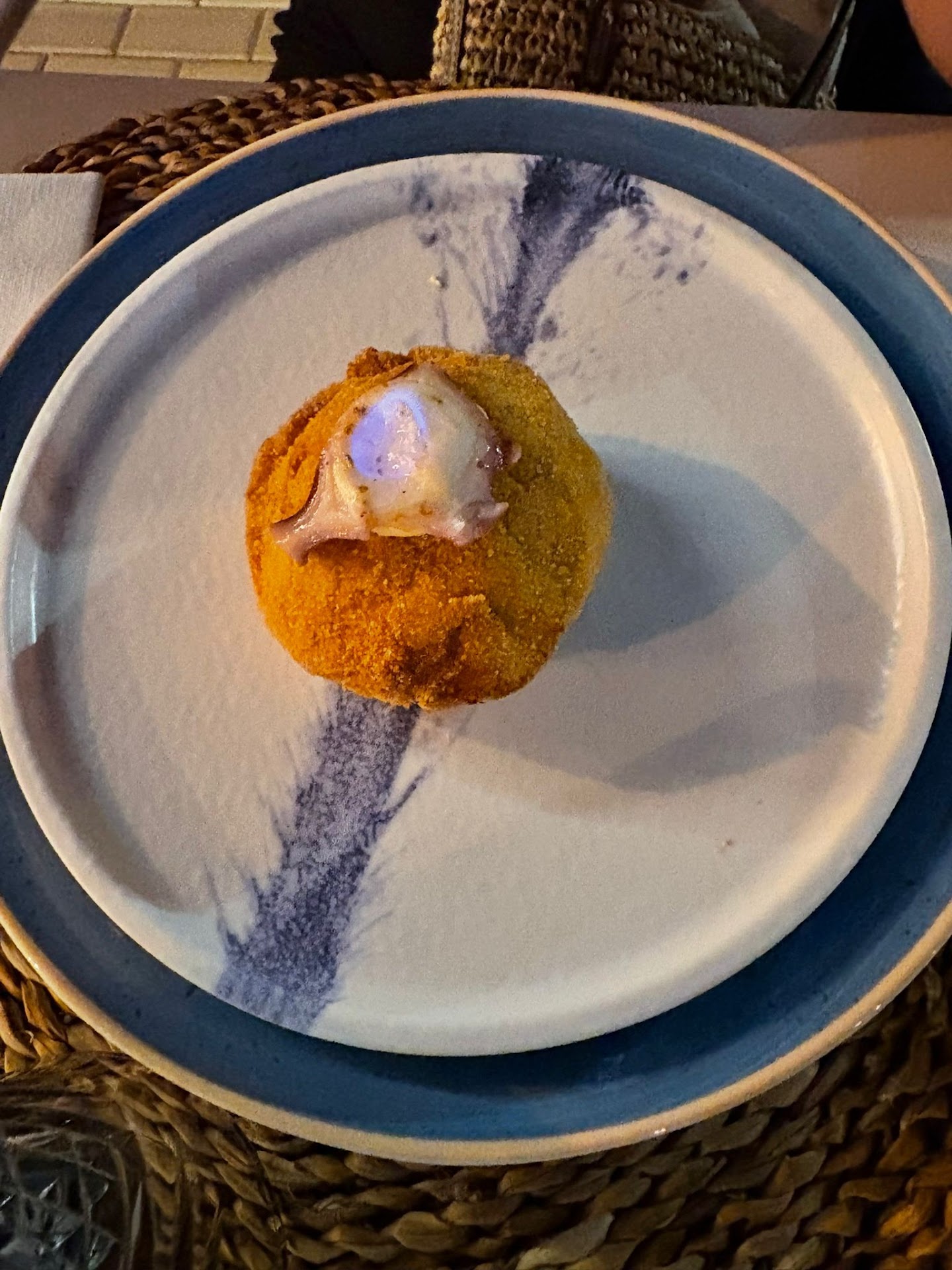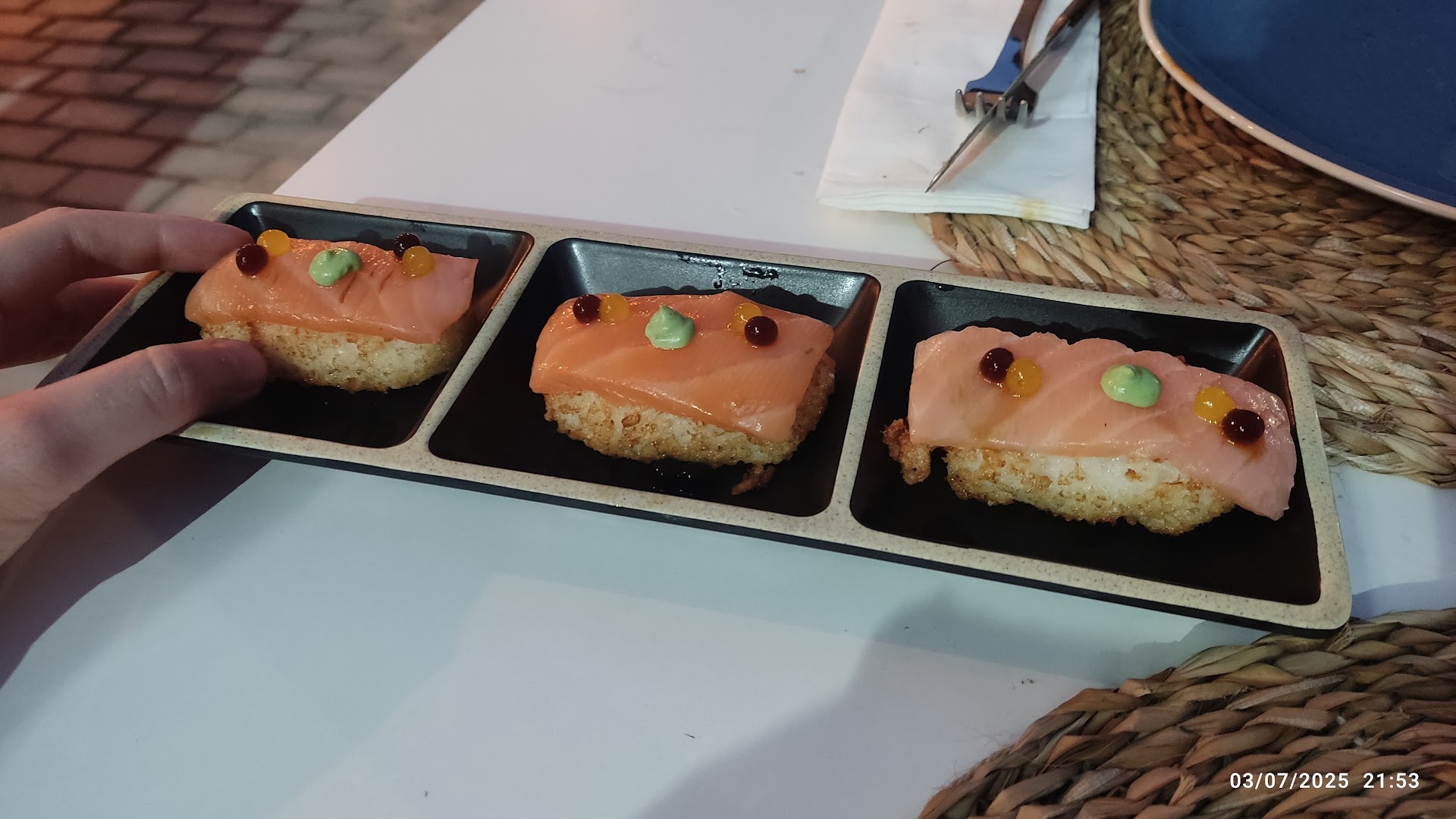 Read moreRestaurante extraño en tanto que de calidades muy dispares. El ambiente muy agradable, la persona que nos atendió (Germán) muy agradable y muy atento. La comida: difícil de clasificar. Comimos la ensaladilla en churro (muy buena y muy original), la croqueta XL de pulpo (meh, sin sabor, un mazacote, no la recomendaría), los bollitos rellenos de carne (originales y ricos), el canelón de pato (bastante bueno) y por último y peor el sashimi de salmón. No he comido una cosa tan mala en el restaurante por 16€ en toda mi vida. Tres lonchas de salmón regular sobre tres bolas de arroz mal cocido, pastoso y prensado, rebozadas. 16€. Horrible. Para dejáraselo en el plato. En resumen, volvería y pediría cosas que fuesen fáciles de cocinar y que su ingrediente principal fuese carne, y además la ensaladilla sobre churro que para nosotros...