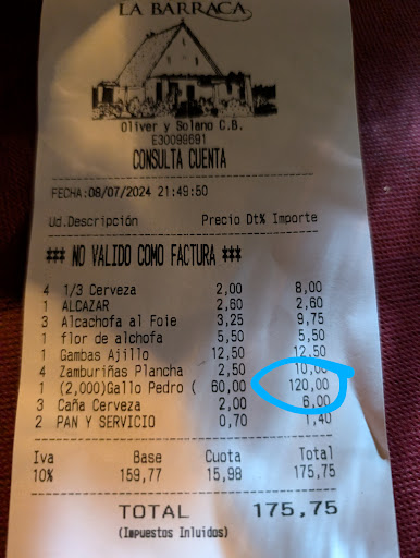 Read morepongo una estrella porque no podria poner este escrito, me hubiera gustado poner la foto del ticket pero luego comentare el porque no le tengo, era un sitio hace años espectacular comias un monton, rico, y los precios fenomenales. Y decidir ir hace unas semanas con una amiga,nos pusimos en la barra de cualquier manera porque no cabiamos, y llego la hora de pedir, una ensaladita, 4 cocretas,2 pimientitos de piquillo rellenos, un platito pequeño de almejas una cañita, un refresco y bueno la crem de la crem unas gambas. Nos ponen 6 langostinos del tamaño de las gambas arroceras pero 6 y blancos cocidos, me quede loca, y me dice que son 250g.en fin... Ante el hambre con el que nos quedamos, pedimos dos heladitos y la cuenta. Me quede FRIA. 63€, PERO LO MAS FUERTE LOS 6 LANGOSTINITOS 24€!!!!!!! hable con un dueño y le dije me has cobrado a 12 € 3 langostinos? Y me contesta con vacileo sii claro es que vale el k 120€pero en la carta no pone nada de precio por peso o gramos. Me dice que la poblacion a crecido y no tienen gambas para avastecerse, no sabia si reirme o decirle algo pero preferi comportarme. Me dice que me da 5€ coje el ticket lo tira y me dice que estamos en paz. FLIPANTE. No volveremos mas a este sitio, y os aconsejo el que quiera comer bien ir a bonobo la manga os aseguro que gambas no os van a faltar unos trabajadores fabulosos, una comida riquisima y unos precios...