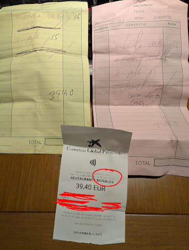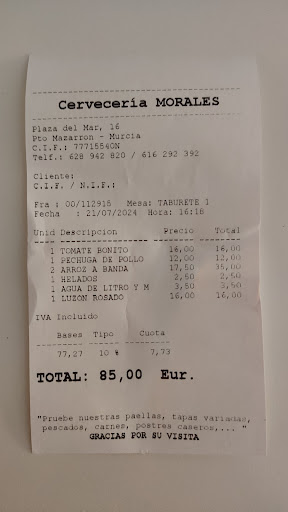 Por último, la cuenta es una pasada, un rejón en toda regla. 2 adultos y un niño, vino de la casa y sin postre 85 PAVAZOS... Ole vuestras narices!!! Eso para rematar...