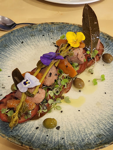 Low key restaurant in the port surprises with exceptional flavor combinations, perfect cooking, and well done dishes all around. Oil toasted bread with paprika arrives with ali oli after some crunchy snacks. We started with a local excellent heirloom tomato and tuna escabeche salad that was beautiful and flavorful. Continuing on to a unique combination of braised artichokes with garlic-chile-olive oil clams is a savory heavenly match, especially when sopping up the oil with the bread. Fresh in the shell sea scallops with torched kimchi mayo were perfectly cooked, but could have used a little less mayonnaise on top. Crema de orujo with coffee was a perfect ending. Attentive, friendly and helpful service, great plating. Decor needs some help, and hard straight back wood tall chairs could be softened, but we still had a great time....