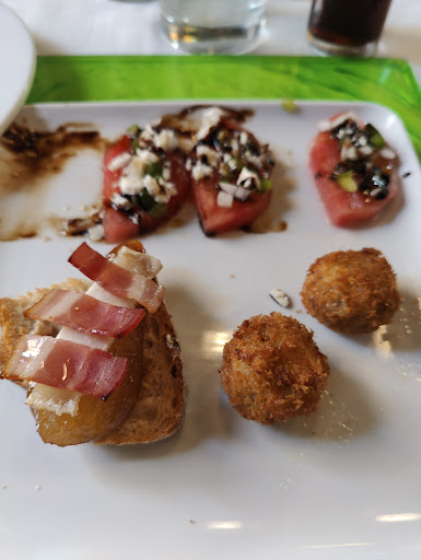 Works differently to most restaurants in that you are brought the first course which is chosen by the staff. Typically includes salmorejo (a soup, similar to gazpacho but thicker), potato croquettes, pinchos of bacon, goats cheese & pear (on one pincho - 'pincho' or 'pintxo' in the Basque Country is the northern Spanish equivalent of 'tapa') & endive with a delicious tomato, cucumber and onion mix.