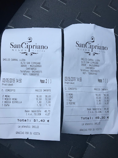 Bueno lo primero decir que la comida es realmente muy buena, pero o dueño o propietario deja mucho que desear, le dije a este señor que lo haría saber a todo el mundo como estafa con el cobro a los clientes. En fin nosotros somos una familia normal y corriente que fue a cantabria de puente mayo y fuimos a comer el pote ganador de 2018. llegamos mi mujer, mi hijo de 3 años, mi hija de 1 y yo, mi mujer y yo pedimos el menú que llevaba el pote cada menú era 18 euros hasta ahí todo bien, la niña llevaba puré que llevábamos nosotros ella nada, y el peque había un menú normal de 10 euros que había le llamaba el menú obrero.... de segundo cinta de lomo con patatas y sabíamos que eso lo comía muy bien, hablamos con la camarera y le dijimos si podíamos coger el 2 plato del menu para el peque dijo que ok que sería medio menú que entraba la bebida y el postre, la bebida no pedimos para el ya que bebía el agua de la botella de mi mujer, cuando ya estábamos con el postre el niño comió yogurt y le dijimos si nos podía sacar otro para la niña que lo pagábamos hasta ahí todo bien. Pedimos la cuenta fueron 2 menús de 18 euros, uno de 10, 1 café aparte, 1 otra cerveza. Pues todo estaba correcto excepto el menú del niño que fueron 12.50 entendimos el cobro del yogurt de la niña pero fue medio menú, la camarera al no entender el problema se lío salió el jefe le explicamos lo sucedido y cambió la cuenta a su manera intentando cobrar el mismo dinero de la anterior, mi mujer al no estar de acuerdo se lo hizo saber que si lo llega a ver sabido le pide el menú entero y le hubiera echo el gasto y aparte el niño no pidió bebida y este señor el propietario o encargado ya empezó a perder un poco los papeles. Yo ya dije que no iba a discutir page religiosamente todo y le dije que lo movería por Internet y así estoy haciendo que es donde más duele, nos jorobo la comida era muy buena pero se sobrepasó el propietario, veo que este menú de obrero de 10 euros como decía este señor ya no existe lo subió a 12,50. Aqui os dejo la foto con los tickets de la prueba. Esta fue mi experiencia para que todos lo sepáis es mi opinión y para usted SEÑOR PROPIETARIO DE MESÓN SAN CIPRIANO relájese y antes de hacer cosas en el menú que usted no llega a entender no lo haga...
