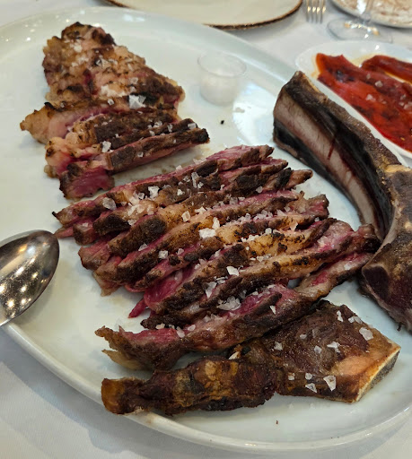 En primer lugar quiero decir que fui con unas expectativas grandes y se me han quedado demasiado bajas ( quizá solo sea mi experiencia) .De ahí que dude las reseñas tan buenas que habeis recibido ... En principio me gustaría decir que soy una persona que le gusta comer carne de calidad ( por eso quería ir ) y que de hecho no escatima nunca en ello , sea lo que sea ... La comida : pedí solomillo , no fue completamente de mi agrado . Lo pedí bien hecho , no fue así cuando me lo entregaron , se qué actualmente el solomillo está a 35€/kg , ponía que era aprox. 300-400grs , no era así ni de por asomo , la carne medianamente pasable, mucho nervio y mucha ternilla , quizá pudiera haber cogido el "peor" trozo . Que me cobreís el solomillo a 35€ cuando son 250grs y ni si quiera haya de acompañamiento una triste guarnición ,en condiciones , me parece de falta de respeto. Por lo que no lo vale . Se que los chuletones estaban bastante buenos , sin más . De guarnición, a parte del plato ... morcilla , torreznos , pimientos , lo que fuerte...no merece la pena , sinceramente, ¿a 7€ la porción?, por llamarlo de algún tipo , porque ni por asomo es una ración , lo siento pero eso así , muy triste. Que te cobren el pan , por llamarlo pan , 1 rebanada de pan a 2€ me parece un insulto . Pregúntame si quiero pan y el precio que tiene el pan, porque sinceramente no merece la pena . De vinos no puedo opinar porque no me gusta , pero se que tenéis bueno vinos . Por otro lado , de cerveza , siendo el sitio que es, ¿solo tenéis 2 tipos ?. El trato de los empleados no termino de agradarme , se les ve buenos profesionales , pero parece ser que a las camareras solo puedes pedirle las cosas a cuenta gotas para que no se agobien. Con el ambiente...( En general ) es un "asador" de polígono industrial, lo siento, pero no estáis en el barrio salamanca , en tres cantos , paseo de la Habana... los precios son completamente desmesurados para lo que es , no quiero menos preciar vuestra labor , pero es así . En resumen .. a mí gusto , no voy a decir que no merece la pena , pero no esperaba que fuese así , me he arrepentido de ir , lo siento. Sinceramente pensaba que iba a ser otra cosa , cuando te dejas además 900€ de cuenta y ni si quiera te pueden invitar a un café , por llamarlo café...