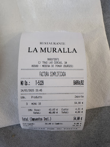Read moreEl restaurante La Muralla en Medina de Pomar ofrece una experiencia aceptable, aunque con varios aspectos mejorables. La comida en general no está mal, destacando las costillas, que estaban tiernas y jugosas, y la dorada, que resultó muy sabrosa. Los postres caseros son otro punto positivo, con buen sabor y frescura. Sin embargo, otros platos como la ensaladilla del plato variado y los mejillones con bechamel fueron decepcionantes; eran sosos y carecían del sabor esperado, ni a bechamel ni a mejillones.