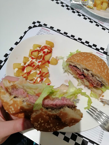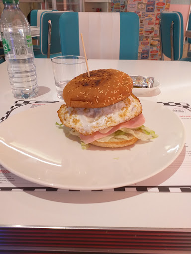 Read moreEl restaurante tiene una decoración estilo EEUU en los años 50 y en aquel momento estaban poniendo La Vuelta en la televisión (buena elección). El trato fue correcto y amable. Los precios son normales, para la gran cantidad de comida que me he pedido (hamburguesa "especial Marbella" (buen tamaño), ración generosa de patatas, agua y helado grande) he pagado 14,40€. La mayoría de las hamburguesas no incluyen patatas, por lo que si las quieres has de pedir una ración de patatas que es bastante grande como para acompañar una hamburguesa a menos que tengas muchas ganas de comer. En mi opinión estaría mejor si pudieras acompañar las hamburguesas con media ración de patatas, que es la cantidad proporcional para la hamburguesa. En cuanto a la hamburguesa, estaba rica, pero a la hora de tostar un poco el lado interior del pan en la plancha se pasaron, por lo que el borde y el centro estaban ligeramente quemados. La carne tendrían que haberla cocinado ligeramente más; no estaba mal, pero lo óptimo habría sido más. Yo recomendaría sustituir la cebolls blanca por cebolla roja porque tiene un sabor más suave. En todo caso, este lugar ha estado bien para repostar después de una...