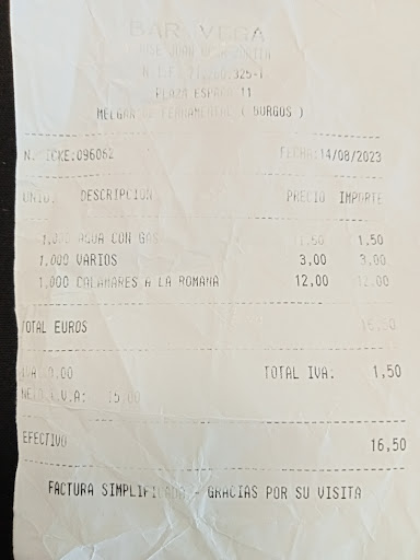 Y llega el momento, la cuenta. 15€ de menú que no incluye ni refrescos, ni cervezas. Pues nada, 10€ solamente 2 refrescos y 2 cervezas. Sumale los cafés.