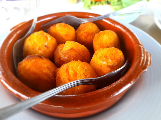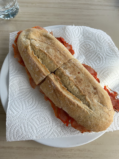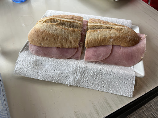 We were looking for a place to sit outside and away from the crazy crowds in the center as we needed to watch our bikes. The woman serving did a great job in communicating with us in English even though she said it was limited. Much better than our Spanish. Biking the Camino means you are hungry earlier than a 2pm lunch. They gave us 2 large toasted ham and cheese buns. Boy were they large. It was hard to find the cheese for the amount of ham in them. The milk coffee was ok and the chocolate croissant...