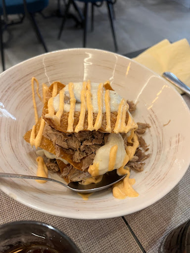 La oferta es atrevida y novedosa. La ensalada de burrata es sencillamente impresionante; las croquetas tienen los sabores MUY bien conseguidos y tienen un buen equilibrio entre el interior y la masa. La lasaña de carne puede mejorarse... la presentación no es muy apetecible y estaba un poco sosa en general, desde la bechamel hasta la carne. La pasta de la lasaña en sí es dura, es como si fuese de torrezno. Vimos salir otros platos que tenían muuy buena pinta, recomiendo probar otra cosa.