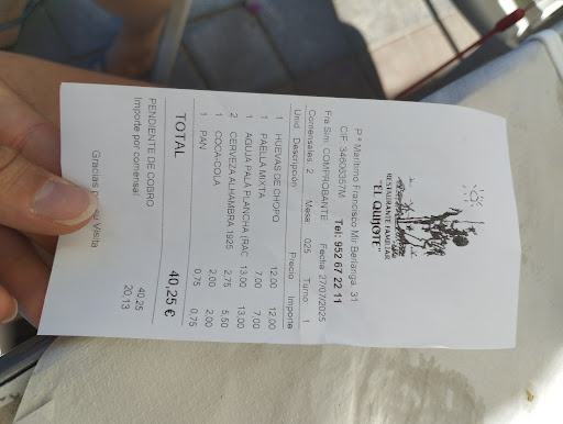 Read moreRestaurante familiar, a pie de playa, con buena calidad de sus productos y trato excelente. He ido en muchas ocasiones, y siempre ha ido todo de maravilla. Tienen mucha variedad y seguro aciertas en lo que pidas, pero destacaría los arroces y el pescado. En esta ocasión pedimos aguja, arroz y unas huevas deliciosas, no las había probado antes y me encantaron, al mismo nivel que en muchas zonas de Cádiz en donde son los especialistas. Siempre recomendaré El Quijote a quien me pregunte. Adicionalmente tienen mucha...
