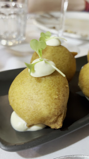 El día lluvioso nos hizo comer en el interior, acogedor y cómodo, aunque también disponen de terraza exterior. A pesar de su carta extensa, nos decantamos por platos para compartir y probar variedad: • Rabas: producto típico de la tierra, no podíamos irnos sin probarlas. Aunque para nuestro gusto un poco menos tiernas de lo que esperábamos, estaban sabrosas bien fritas y nada aceitosas. • Ración de arroz meloso de gambón: espectacular, punto perfecto y de sabor intenso con el toque de ali oli de ajo negro. Pedimos una ración para tres y era un plato bastante generoso. • Ensaladilla de pulpo: diferente, fresca y muy bien equilibrada con el toque de pimentón. • Canelón de carrillera: meloso y lleno de sabor, de los mejores del menú. Sin duda el toque a trufa le da un sabor completamente diferente a todo lo que hemos probado. • Buñuelos de bacalao: cremosos, con el rebozado justo para deshacerse en la boca de un solo bocado. • Tarta de queso: cremosa, nada empalagosa y con un equilibrio perfecto de queso. • Helado de vainilla: dos bolas de helado generosas, bastante cremoso.