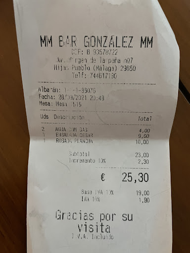 The bill then came and we noticed they had included a 10% ‘incremento’ charge on top. We queried this and they said it was a standard IVA charge. At no other restaurant that I’ve been to has there been this charge. We contested it but we were rudely told to pay up. At this stage we just wanted to go and didn’t have the energy to keep arguing, so we paid. I have since found out that this charge is illegal and restaurants have no legal right to enforce this. Please be aware!