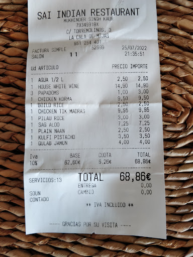 Read moreHaving eaten at many restaurants in Mijas, we decided to have dinner at Sai & it was the best decision we made, as the food, drinks, desserts & service were outstanding. We started with refreshments, ordering a bottle of the house white wine & still mineral water. We then ordered poppadoms, which came with dips, whilst we reviewed the extensive menu. There are the usual favourites, plus a good selection of chef specials. We chose the chicken korma, the chicken Tikka madras, saag aloo, naan bread, pilau rice & boiled rice. Hot dinner plates were then placed on the table, in anticipation of the food being brought out by our waiter. The food looked fantastic & tasted just as it looked - fantastic! The flavours, the aromas, the spices were perfect. After finishing our meal, we just had to order dessert & chose the pistachio kulfi & gulab jamon. Both were divine. Additionally, throughout our dining experience, it was good to see the waiters checking in with us, to see if there was anything else we needed & if everything was ok. Excellent service standards, which other restaurants should take note of. Thank you Sai for a wonderful evening. You are definitely now our "go-to"...