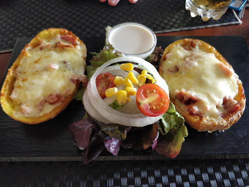 A pub on the edge of la cala de mijas, nothing special about the decor. We booked Sunday lunch for 3pm. Shown to our table on arrival, drinks order taken and delivered and menu's given, then quite a wait to order food so asked waitress if we could order as we were ready, she sent different waitress to take the order. But I must say the food which arrived quite quickly was delicious, we had roast pork which was succulent with Mash, roast potatoes, vegetables and the lightest Yorkshire pudding I have ever had. For dessert I had double chocolate cheese cake with ice cream, again delicious. Well worth a visit for a...