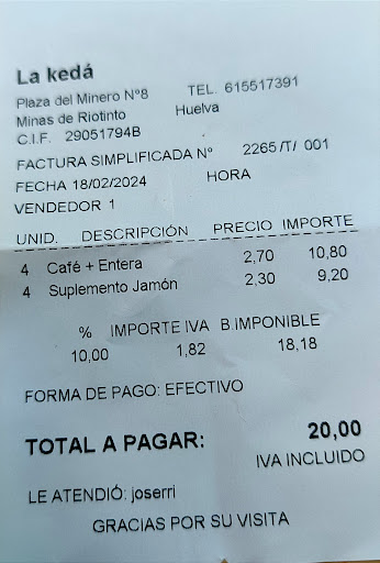 Read moreExperiencia nefasta, hemos llegado a las 15:30 y hemos pedido 4 cervezas, tenían tapas frías ensaladilla atún... Y nos dicen que no pueden darnos nada de comer por que cocina está cerrada, cuando lo único que queríamos era una tapa fría, ni darnos alguna alternativa ni nada, eso sí delante mía pasaban hamburguesas patatas fritas etc.., serían para los conocidos de ellos por qué a nosotros ni unas aceitunas, venimos de murcia y en todos los sitios que hemos parado no nos han tratado así, la camarera muy desagradable y haciendo comentarios de los comensales de fuera, hemos tomado 4 cervezas y nos hemos tenido que comprar dos bolsas de patatas fritas para comer,...