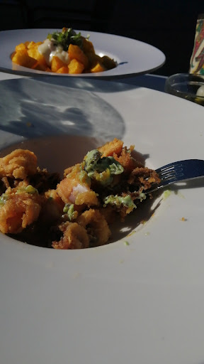 clochinas con un toquecito de cebolla dulce y picante con un caldito bien agarrado y excelente sabor Calamares con verduritas que también tenían una salsa buenísima, de un tono marrón, quizá marinados con soja que han supuesto mi plato favorito Pulpo con patata, una buena pata de pulpo rico ligero y bien cocinado Bravas con un alioli con un toquecito de comino muy buenas Sepia con una mayonesa con Wakame bien rebajada, muy buena Hemos probado, porque teníamos más hambre los huevos rotos con jamón y bien, nada más allá de lo que es el plato en sí. Secreto y entrecot trinchados con guarnición (quizá el trinchado habría sido preferible en porciones más pequeñas y más ordenadas, pero de sabor excelente) Por último, un coulant con helado de chocolate muy bueno