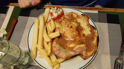 Lo que pedimos: • Entrada: Un plato de papas con cheddar, bacon y huevo. ¡Impresionante! Abundante, ideal para compartir y acompañado por una salsa de la casa que nos voló la cabeza. Un sabor único que realzaba todo. • Principales: • Escalope de ternera a la napolitana. • Escalope simple. • Lasaña con carne, verdura y crema.