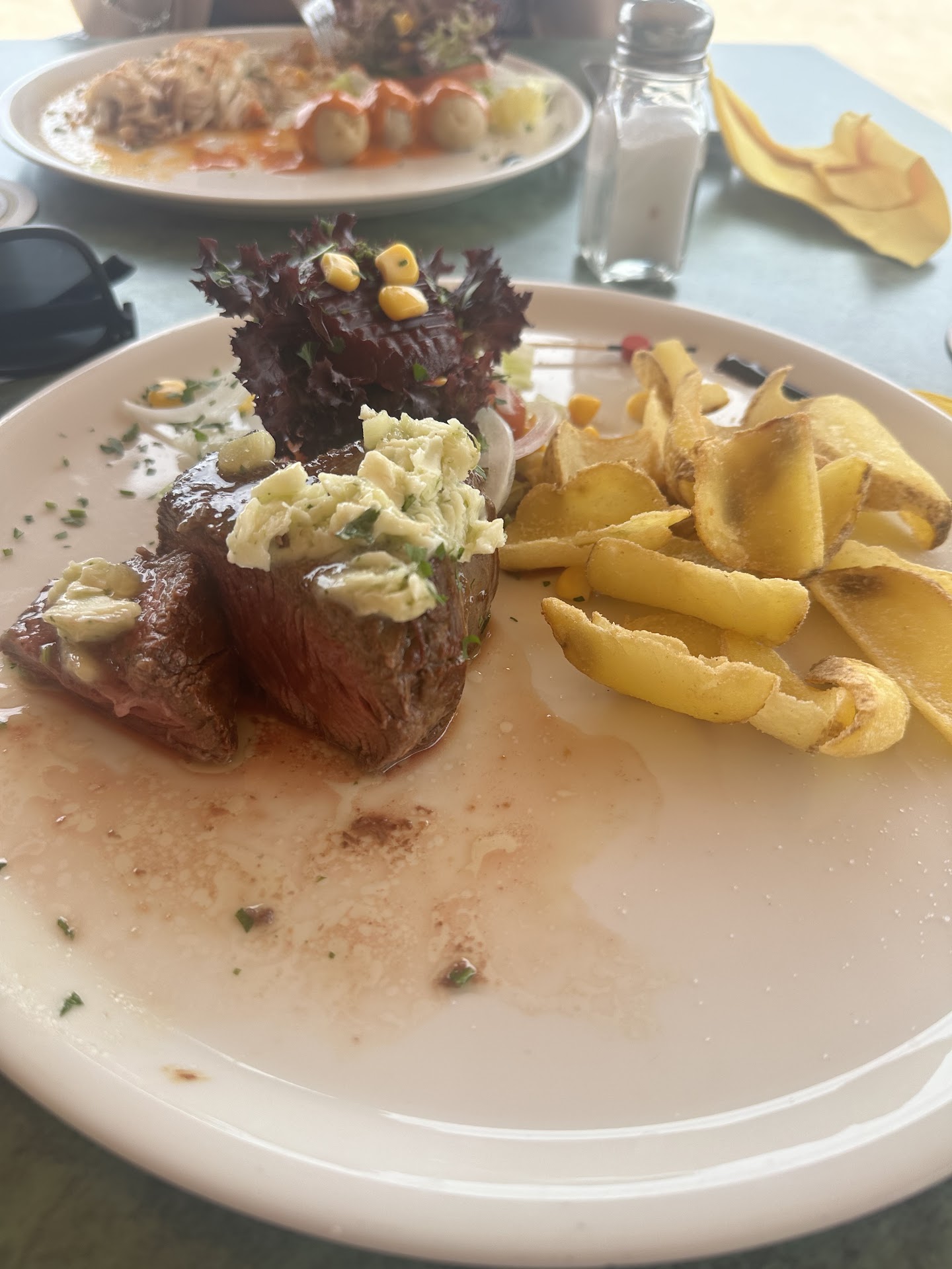 My husband and I visited this place yesterday and it's quality of food and customer service blew away our mind. I was glad I found this place with marvelous food, beautiful sea views and exceptional customer service. Our hostess Catherina (or Christina maybe) made sure we were taken care of really well. She was very sweet and attentive. We ordered pork filled with mushrooms sauce, fresh fish of the day, mussels, bruschetta and cherry strudel with vanilla ice cream. Every dish was outstanding. I mentioned to Catherina how a similar dish I ate the day before yesterday was very disappointing at a different place and she made sure mine had good amount of sauce and to my liking. Their mojo sauce was also great. I highly recommend the bruschetta which was quite fresh and each plate was carefully made with fresh ingredienf them were stale like you usually find in touts. None of them were stale like in those touristy beach side restaurants. The portions of drinks and dishes were huge. Get a table with beach view and chill there as you get served with great food, love and attention. I chilled there for 2-3 hours as my husband went and took a dip in the beach and it was such a relaxing time there. I would totally go...