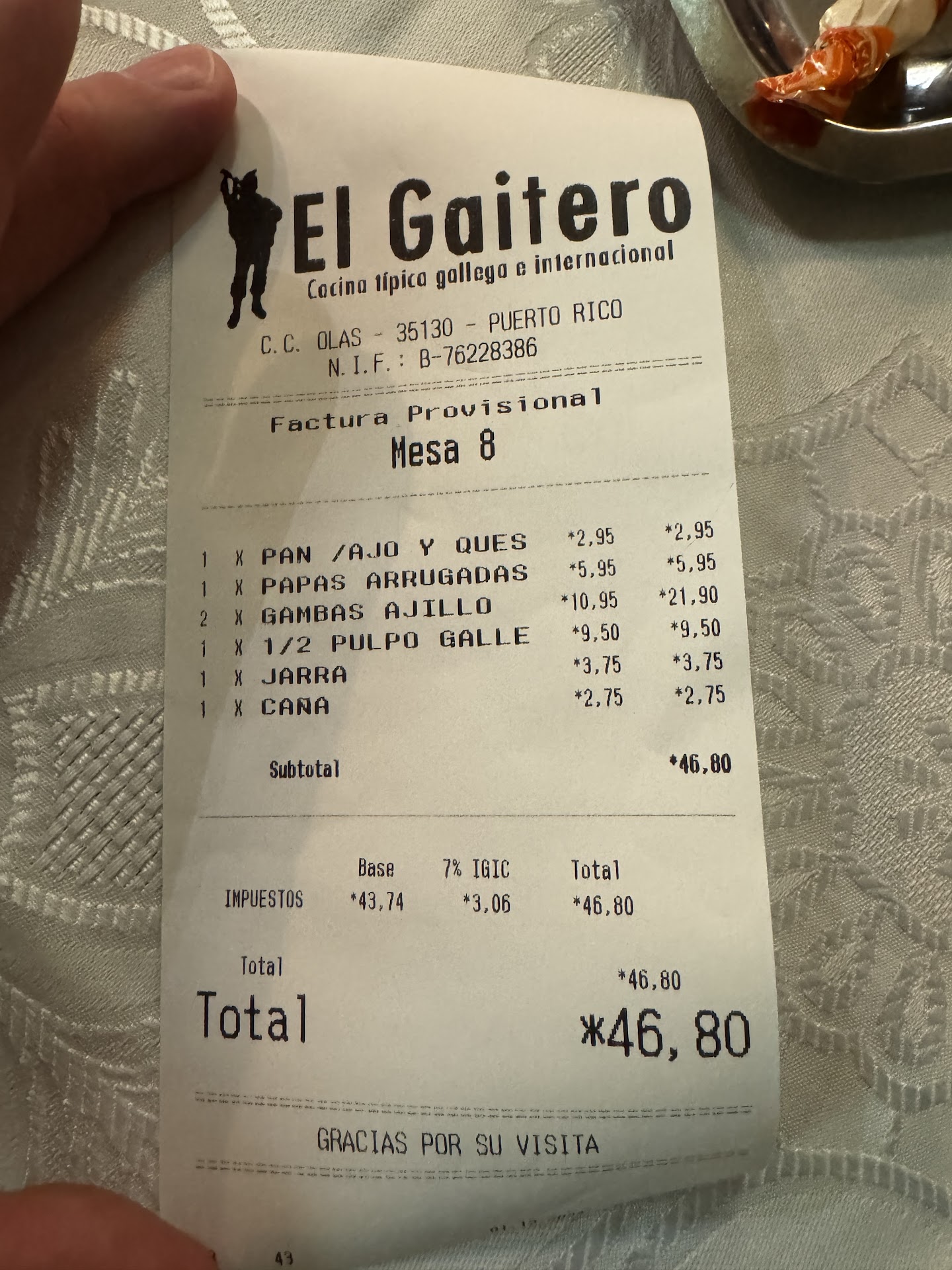 Read moreWe were recommended this restaurant by another restaurant in the same complex and for the most part it was a good experience. We ordered a lovely bottle of dry white wine and shared the boiled octopus with paprika and olive oil which was beautifully cooked and well presented. For mains I had the sea bass in salt with Canarian potatoes which were nicely cooked and tasty however it came with too many bones, which unfortunately I swallowed making it difficult to finish. My partner had the cod on a bed of spinach which he described as overly salty but managed to finish it. The service was inconsistent as most of the staff there were polite and kind as with many of the staff at restaurants we’ve been to here, however our main waiter we felt to be quite rude as he didn’t make eye contact with us at all, never asked how our meal was and wasn’t very attentive. When we paid he was very silent and didn’t wish us a good evening.