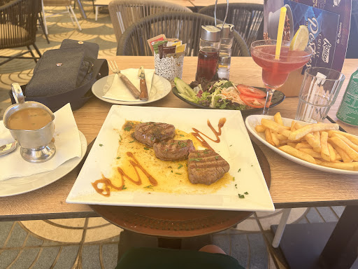 The location is spot on—right on the seafront with a fantastic view over the beach and sea. It wasn’t too busy, so we managed to grab a table with a great view. The vibe was relaxed, the staff seemed cheerful, and there was music playing along with three different football matches on the screens, which added a lively touch.