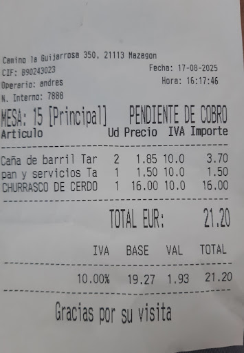 Read moreDecepción absoluta. No hay derecho que con unas reseñas de 4.6 pidamos unas gambas a la plancha y dos doradas salvajes (creo que no saben el concepto de lo que eso significa)a la plancha también y la primera sorpresa es que te traen las doradas antes que la gambas. Cuando les avisas que eso no está bien que primero se sirven los primeros y luego los segundos porque no estás pidiendo cosas de batalla, ni baratas y porque aunque lo fueran eso no se hace así, te piden disculpas pero te sacan las gambas a la vez que te estás comiendo el pescado. Para continuar con el desastre las doradas están fritas con harina acompañadas de unos pimientos fríos que parece que acaban de sacar de la nevera y desde luego de salvajes no tienen nada. Las gambas están fritas también y de dudosa calidad quedándoseles la piel pegada. Después de una semana en Huelva comiendo esa maravilla de gambas de la zona, repito, no hay derecho. 85 euros de cuenta por una comida de una calidad muy lejana al precio que cobran. Mi hobby es comer y se cuando me...