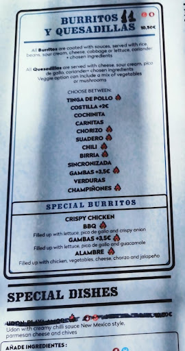 Read moreConfused?? You will be if you order a prawn burrito. A riddle.... what do you get when you order a prawn (gambas) burrito? No rice or beans and charged extra for less 14.50(should have been 14.00 with rice and beans). The list for burritos and quesadillas say they ALL come with rice and beans, but not the prawn one as that's a special burrito. We didn't order a special burrito, we ordered a normal one(we pointed this out to who we believe is the owner/ manager). He told us thats quesadillas list, however the vegetable one underneath the prawn it is a burrito, as is the sicronizada above it. Stupid us huh, that's how we were made to feel, but have a look at the photos of the menu and make your own mind up. Have to say staff were lovely but owner/manager could do with some customer service skills. Instead of shouting down customers at their table it would perhaps be helpful to recognise the menu is confusing and offer the rice and beans? The attitude definitely spoiled our experience so although the food was nice it would put us...