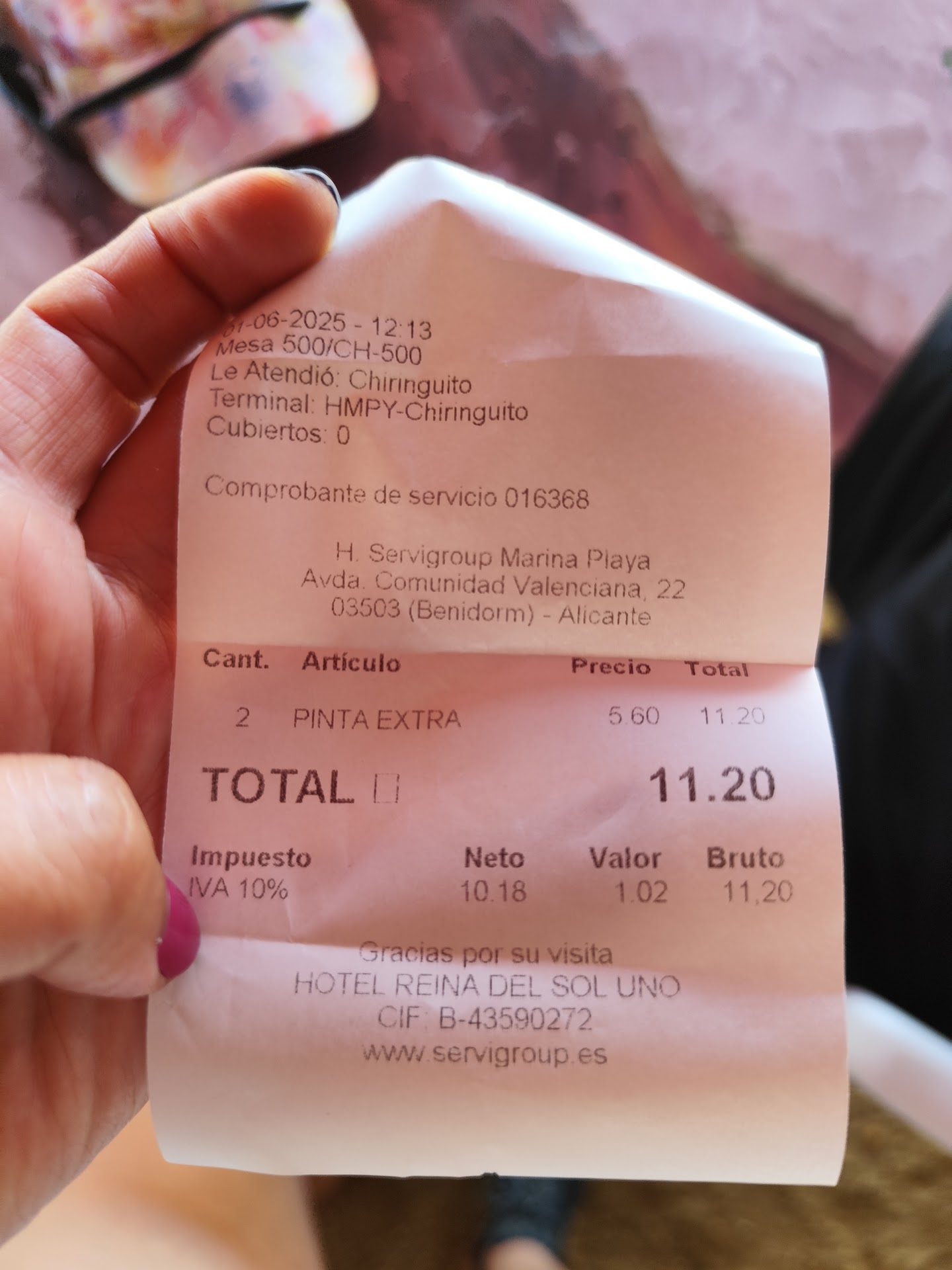 Overpriced drinks. There is no information of drinks and when you sit. They take drinks order when you sit, before they provide any information. This is of course classic spanish hospitality. They have Cruzcampo and it costs €5.60 each pint instead of €4.00 or €4.50 for being close to the beach at a summer month.