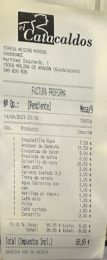 El sábado 16 de agosto a las 14h hacía mucha calor en Molina, como en el resto de España, entrar en el restaurante Catacaldos fue un respiro, se habia reservado con días de antelación, ibamos a ser 7 personas adultas y el viernes llamamos para ampliar a 8. Ya habian avisado lo que señalan en la carta, indicar con tiempo las parsonas que querían paletilla. el entrar a las 14:20 y tener nuestra mesa fue un alivio, con la sensación de un lugar espacioso y una temperatura agradable. Nos sentamos y en seguida nos preguntarano que queríamos para beber, pedimos cervezas, agua y vino tinto Coto de Hayas reseva viñas del cierzo.trajeron la bebida y nos preguntaron que al ser cuatro los que habían pedido paletilla de lechal si los otros cuatro pediriamos primeros y segundos, entre nosotros ya lo habíamos hablado y le dijimos que pusieran dos ensaladas ilustradas en el centro (una de ellas sin escabeche) y los segundos juntos. No tardaron mucho y llegaron las ensaladas para el centro y una ensalada de melba con tomate rosa individual y mientras la aliñabamos llegaron las cuatro paletillas las tres carrilleras de ternera guisadas y cuando la persona de la ensalada melba termino le trajeron el silomillo de cerdo marinado y a la plancha.Las ensaladas normales, las carrileras muy bien guisadas, gustosas y untuosas, las patatas un añadido de freidora, no le aportaban nada al plato. Las paletillas en su punto, muy bien para una persona y el solomillos muy bien presentado y en el punto solicitado por el comensal. Los que pedimos postre postre pedimos helado de estrataciella, flan de chocolate y natillas al romero. De entre todos resaltó el sabor y arona del romero en las natillas, cuando quise hacer fotos del postre ya habíamos dado...