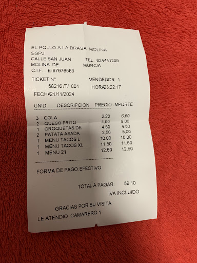 Read moreNo vayáis a este sitio si no queréis que os estafen. Adjunto la cuenta, para que contrastéis con los precios de la carta si acaso vais. Esta cuenta es del día 22 de noviembre de 2024. Todo actual. Además destaco que han cobrado la bebida aparte cuando debe ir incluida en el menú. Fuera de menú se pidió solo 1 bebida más, y han cobrado un menú XL cuando se pidieron dos menús L. No nos hemos dado cuenta porque habíamos pedido otras cosas sueltas, y al revisar la nota más tranquilamente hemos visto todas las irregularidades. La comida no está mal, carne a la parrilla, de hecho ves la parrilla nada más entrar y es enorme, pero el servicio es lamentable. Hemos ido por primera vez y desde luego...