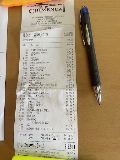 Read moreHace unos días con motivo de nuestra jubilación fuimos a comer a este restaurante un total de ocho personas (adultas). El sitio es nuevo y muy agradable y la separación entre mesas es suficiente y evita tener la sensación de agobio de otros locales. Días antes estuvimos viendo tanto la carta como los menús de que disponen y finalmente nos decidimos por el menú de 42 euros. El servicio estuvo bien y los tiempos de espera aceptables. Los aperitivos y los entrantes (todos al centro) estuvieron bien de preparación y sabor y la única pega que les vi fue que tanto los dos platos de mojama, hueva de mújol y almendras como las dos ensaladas la Chimenea me parecieron escasos para ocho personas. En los platos principales surgió el problema. Tres personas pidieron pescado (lubina al ajo pescador y bacalao confitado) y fue un acierto total en cuanto a sabor y textura, simplemente muy bueno. Las otras cinco pedimos carne y nos equivocamos totalmente. Una pidió chuletas de cordero y se las sirvieron hechas por un lado y crudas por otro …; la camarera se las llevo y las trajo bien hechas. Tres personas pidieron paletilla de cabrito al horno y lamentablemente fueron servidas sin terminar de hacer; aunque se nos dijo que se podían volver a meter al horno los comensales no lo aceptaron porque suponía tener que esperar unos 15 minutos más. Por último, yo pedí un entrecot de ternera y no estaba bien “sellado” y eso lleva consigo la pérdida de sabor de la carne. Dado el "mal rollo" que había en ese momento en la mesa opté por comerme más o menos la mitad sin dar ninguna explicación ya que el nivel de enfado iba en crescendo, sobre todo en la gente que había...