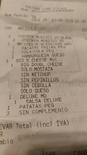 Left 12.65eur for them, as food was not coming out in timely manner. I had to pick up my daughter from therapy at exact time and had no wiggle time at all. You would think McDonald's should be the fastest place to kill your hunger at any time. Unfortunatelly,after placing most simple order of two chicken sandwiches, water and small fries had to wait over 10 min and to leave without food after prepaying for it (Enjoy my free money McDonalds)! Staff was rude and slow...place was not busy,barely 5 orders maybe, but they moved like they were sleepy flies and acted as they own the place. I had bad experiences before with mcdonalds but never as bad as in spain and never as bad as in this place. Probably quicker to go via drive through,but that ends up with little control over quality ( i.e. always undersalted fries and falling apart sandwiches). Pitty and sad. Enjoy my 13euros because of tour lazy staff. Maybe this is...