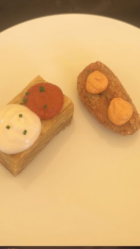 Vam anar amb un menú tancat de 24 €, dinar, cafès apart. Eren uns aperitius i un segon a escollir. Els aperitius molt bons però molt poc abundosos (l'única croqueta que tocava per cap, espectacular, molt i molt bona). El segon a escollir, no vaig tenir (gens) de sort, un plat de tres gambes amb uns pocs musclos, no gaire calents (de fet tirant a freds) amb una salsa molt aigualida, francament molt però que molt millorable. El postre un pastÃs de formatge també, poc abundós, i molt cremós (excessivament, cremós) . El vi no estava malament tot i que no era de la terra i vam tenir de demanar el pa. Vaig fer una cervesa que vaig que tenir de pagar apart. Pel que vam pagar (eren més de 30 persones), francament molt però que...