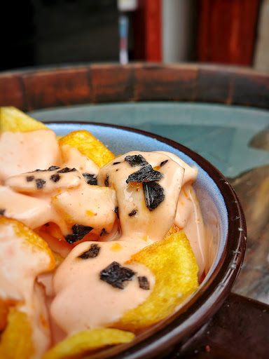 La ración sale por 4,50€ y la media, por 2,25€. No son patatas congeladas, y la salsa a pesar de ser salsa rosa, han sabido darle un toque propio (aunque siga siendo salsa rosa...). ☹️