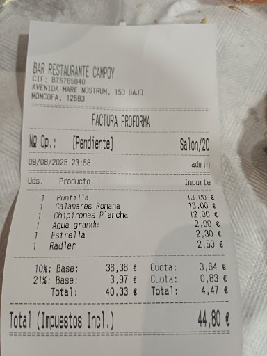 Read moreHoy hemos ido a una feria de antigüedades en Moncofar hemos ido a almorzar 5 amigos y el almuerzo ha sido algo caótico, un restaurante en el que hay 3 personas en la cocina y 5 en barra para servir un bocadillo por cabeza casi 1 hora, nos hemos sentado a las 09 con el bar vacío y no tenían ni pan, después les pides la bebida y 40 minutos después llegan los bocadillos, más pan que mezcla un horror veías a los y las cámaras danzando por el bar sin ningún control, el caos ha sido pedir el café varias veces y que jamás nos lo han puesto , nos hemos levantado a las 10:30 para pagar y tampoco se han aclarado para cobrar , con gente así se van las ganas de salir a almorzar, un caos de servicio lento y malo, no hay aire acondicionado mucha calor , en cualquier sitio por 10€ por cabeza te ponen buen genero cantidad y por supuesto si pides el café te lo sirven , 10€ por cabeza sin café por un bocata de calamares bastante excesivo ,nada...