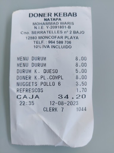Cuando pasamos hacia ell mercadillo, estaba lleno de gente tomando café y tostadas. Nos llamó la atención y mi Hijo nos pidiò que fuésemos a comer allí, porque le encanta el kebab. Así que, a mediodía pasamos y preguntamos si podíamos comer, nos dijeron que sí. Nos sentamos en una mesa donde había dos tazas de café y vino el chico, sin decirnos nada, quitó las tazas y puso los mantelitos para comer, sin limpiar la mesa, aunque había algunas gotitas de los cafés, pero bueno, los manteles las tapaban. 😂😂😂 Se fue y no preguntò si queríamos bebidas ni nada. Al cabo de unos minutos volvió y ya pedimos la comida. Todos los menús están sobre 7-8€, constan de plato principal (kebab, rollo de kebab, calamares, alitas, croquetas de merluza o nuggets), patatas y refresco. No sirven bebidas alcohólicas, sólo tienen cerveza sin. (Me parece genial) Enseguida sirvieron las bebidas y, en unos minutos, las patatas👍🏽. Luego vinieron los rollos de kebab, que son pequeños para lo que yo tengo acostumbrado, pero son un tamaño ideal para comer bien, junto a las patatas. El mío estaba buenísimo, las verduras frescas, bastante carne y la salsita lo hace muy sabroso. A mi Marido le decepcionò que no le pusieran la salsa picante dentro, le dejaron el bote en la mesa y se iba poniendo a cada bocado, pero lo encontró bueno. Y mi Hijo se comió las patatas y se dejó la mitad del rollo, pero es suficiente para él. No vimos que tuvieran heladitos ni anuncian ningún postre, así que nos fuimos a un horno cercano a comprar una tarta de manzana. El precio estupendo: 24€...