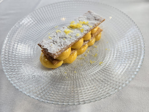 A Destacar: ( todo esta bueno, solo destaco algo) el aceite de Wakame, un aceite super conseguido, que consigue el color verde con Wakame y el aroma que coge del ajo es intenso y agradable. alubias con gambas: increible, cocción al punto sin que las alubias se rompan y armonia de sabor perfecta. parmentier, pures de base de las carnes: simplemente es perfecto. jarrete de cordera: sin comentario, solo lo teneis que probar. Foundant: cuando dijeron que tarda 14 min. Para salir dije, más vale que lo hagan bien, solo decirles que me salio la risa cuando lo probe, puedo decir que es el mejor foundant que he probado en Galicia. milhojas de limón: un miljohas que se sale del patron del hojaldre, que esta muy bueno aun no teniendo mucha mantequilla, y la crema de limón muy equilibrada de sabor entre la acidez del limón y la dulzura.