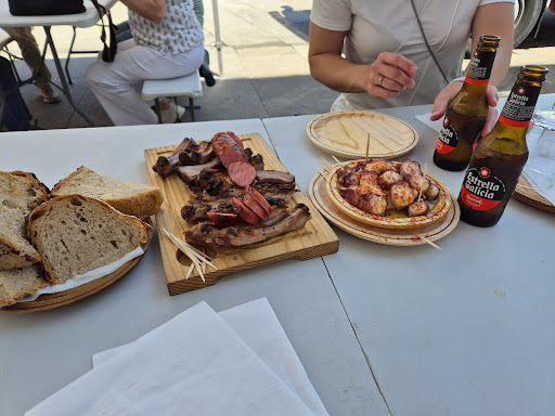 Read moreUna suerte el haber visitado Mondoñedo un jueves para poder comer aquí (abren solo los días de mercado, los jueves). Tienen solo 3 platos: pulpo, lacón y churrasco, pero los cocinan en la misma calle de maravilla (lacón no pedimos). De postre tarta de Santiago (muy rica) y queso con membrillo, además del café de puchero. Todo de 10 y muy bien de precio. Gracias por...
