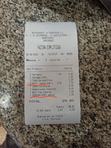 Nos paramos como muchas otras veces en este bar para tomar unos bocadillos o unas raciones. Llegamos a las 15h55 y la camarera, que nos va a atender durante el tiempo que estamos allí nos muestra su descontento porque pensaba cerrar la cocina (habría hecho mejor en decirnos que estaba cerrada, o habríamos hecho mejor en irnos al verla con esa cara). Pedimos un plato combinado, una hamburguesa y un bocadillo de jamón ibérico de bellota partido por la mitad, le advertimos que nos traiga un plato más para la otra mitad del bocadillo. Terminamos y para terminar con buen sabor de boca pedimos un postre, como otras tantas veces, para compartir. Al pedir la cuenta (adjuntada), nos cobra 2 montaditos de jamón, y Servicios Varios. Cuando preguntamos si se trata de un error, la misma camarera nos dice que han cobrado 1€ mas porque han traído un plato para una de las mitades del bocadillo, y Servicios Varios porque han traído más cucharadas para un postre (nosotros pensábamos que era el pan). Sorprendidos, ¿cómo es posible que ella haga lo que quiere y que no informe cuando el cliente pide un plato que será facturado 1€ más? La camarera se defiende diciendo que el lujo hay que pagarlo. Aunque las formas y amabilidad entran dentro del "lujo". Y que bastante es que nos ha atendido porque la cocina estaba cerrada. Pero si nos lo hubiera dicho cuando hemos llegado se habría evitado estás malas maneras. Pedimos el libro de reclamaciones. Ella no sabe ni dónde está y tiene que ser otra persona quién lo va a buscar. Bravo al servicio de lujo... Y claro, tampoco se quiere identificar ni firmar. No son los 2€ de más porque siempre dejo propina cuando las cosas están bien hechas, sino las formas al pedir las...