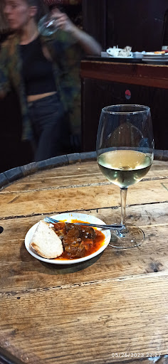 Trato genial, camarero muy amable, buenos vinos y las tapas muy ricas - con cada consumición dan una tapa, incluida en el precio de la bebida (las empanadillas tienen un suplemento de 80 céntimos y bien merecen la pena, están buenísimas). Local pequeño con encanto y sitios para sentarse o estar de pie, en taburetes y la barra. También tiene terraza con varias mesas si el tiempo permite (algunas mesas tapadas con toldo, fuimos un día de lluvia y había gente sentada fuera). ENGLISH: friendly, very helpful waiter, good wines and lovely tapas. You get a tapa to choose from the selection on the board with each drink, included in the price (the empanadillas - small meat pasties - have a supplement of 80 cents and are well worth it). Note tapas only come with a drink, you cannot order any tapas separately, the point is to have a small bite to eat with a drink. Lovely small bar, with a few places to sit, stand or perch on a stall, as well as an area with tables outside that has some cover (we went on a rainy day and people were...