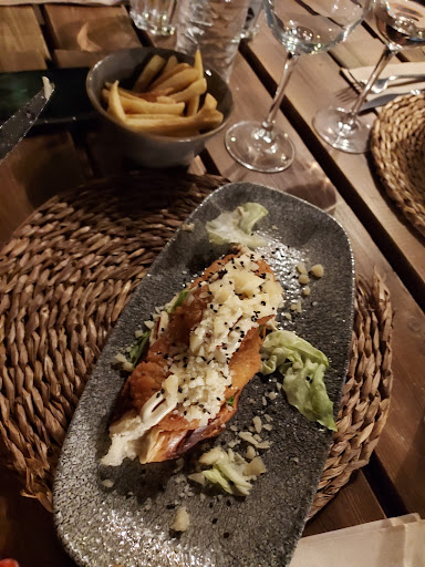 Wij hadden carpaccio van witvis, salmorejo, tonijntartaar en kipspies met rijst. De kinderen hadden kindermenu's. Alles kwam los van elkaar, eerst onze zoon toen de andere, toen een voorgerecht en weer eentje. Totaal geen regie in de keuken. Het eten dreef in de olijfolie, waardoor lichte gerechten toch zwaar voelden en het niet lekker was. De kip werd gedomineerd door terriyakisaus. wat je enkel proefde. Frites van de kinderen waren slap. De salmorejo was lekker.