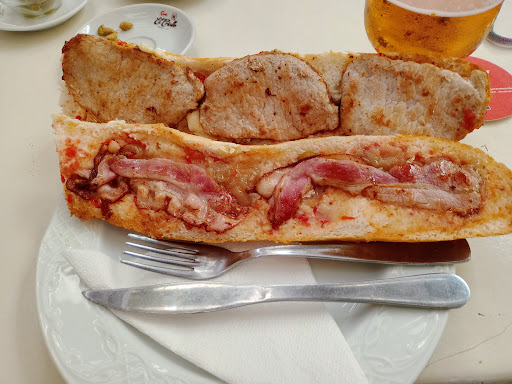 No se sirven comidas, solamente bocadillos, que cuestan entre 3 y 4 euros (la mayoría 3,50€ y 3,80€). Para el precio, están bien. Los bocadillos son simples: de tortilla, de pollo, de jamón... Yo recomiendo el de butifarra; llevaba tomate untado en el pan, cebolla caramelizada y la carne, que tenía bastante pimienta. Aún así estaba rico.