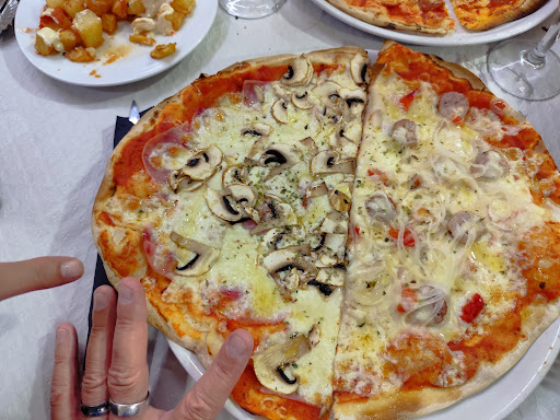 Read morePARA REPETIR Conozco el lugar hace mucho tiempo pero no había entrado nunca, hasta que este viernes 2 de mayo fuimos a cenar una cuadrilla de amigos, de los cuales algunos son clientes habituales. Pedimos de entrante unas patatas bravas; lo cierto es que estaban como tienen que estar unas patatas bravas, primeramente cocidas y luego fritas. Blanditas por dentro y crujientes por fuera con sus dos salsas, la emulsionada y la picante. Muy buenas. Después comimos cada uno una pizza, las cuales las partimos en cuatro trozos y cada cual comimos de todas las pizzas. Estaban todas exquisitas, a destacar para mi gusto la de champiñon y jamón dulce. Generalmente pregunto siempre si el champiñon suele ser natural, ya que no me gusta el de conserva. Aquí no pregunté como eran los champiñones porque la buena pinta del establecimiento ya me quería indicar que serían naturales. También me gustó mucho la catalana, con butifarra, cebolla y pimiento rojo. Para mi gusto el aceite picante (casero) realza más el resultado final; la foto que aporto es de estas dos pizzas. Como se puede observar en la foto son de buen tamaño, por lo tanto, hay que ir con hambre, y si no, lo que sobra siempre se puede llevar a casa. La masa de las pizzas me encantó, fina y crujiente como si fuese un barquillo. La parte del tomate, queso y demás ingredientes correcto tambien. Los postres caseros muy ricos, en este caso por decir algo, el flan estaba muy bueno de sabor, pero tal vez un poco pasado de cocción. Y el helado de chocolate, no sé que marca era pero estaba realmente exquisito. No puedo dejar de reseñar la simpatía y la atención de las dos chicas que nos atendieron. Simpáticas y eficaces sabiendo lo que hacen La relación calidad precio estupenda. Pare resumir, cuando vuelva por la zona volveré...
