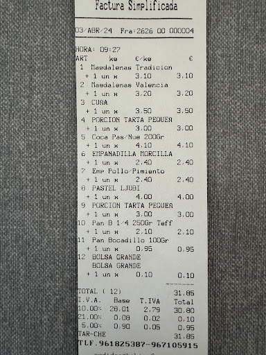 Read moreUn lujo de panadería. Tiene mucha variedad de productos y de buena calidad. Todo lo que he probado, para ser sin gluten estaba realmente logrado exceptuando los fartones que si estaban bastante secos. El resto de cosas buenísimas. La empanadilla de pisto incluso la congelé y al descongelarla solamente dejándola dentro de la bolsa hermética estaba igual de buena. Una pena que no viva más cerca para comprar todos los días. Consejo: si vas en busca de algo concreto encárgalo previamente o ve muy pronto. Está todo tan bueno que las...