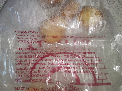 Gran variedad de dulces y salados, diría yo todos artesanos. Impresionantes grosores los de las empanadas ( ternera, pisto manchego, cabello de ángel….) unos tres dedos aproximadamente, masa de hojaldre fina y dura. Magdalenas y rosquillas ricas, ricas y tartas y bizcochos para todos los gustos. Imposible resistirse a llevarte un poco de cada. Los precios desde los 9€/kg de magdalenas y rosquillas a los 19€/kg de la empanada de cabello y tarta del día que era crumble de manzana. Ideal! Venden tambien unos panes preñados de ración diría yo, muy ricos también a 3,50€/ u. Venden panes variados tipo hogaza, payés, etc, tambien. Tienen una especialidad dulce que llaman “cojonudos” envasados al más puro estilo industrial, en blíster de plástico, que aunque están para chuparse los dedos, tengo claro haberlos comprado en grandes superficies. Son una especie de lazo de hojaldre bastante húmedo y blandito con almíbar, espolvoreados de azúcar glass, muy dulces (mucho). La chica que nos atendió (elaboraba ella misma parte de los productos tambien) era muy amable y nos dio indicaciones de cómo conservar y servir todo lo que nos llevamos, que no fue poco; esto por cada clienta que entra, equivale a esperas algo pesadas en el exterior al sol. Nos compensó con cruasanes y galletas de chocolate de regalo. Fue...